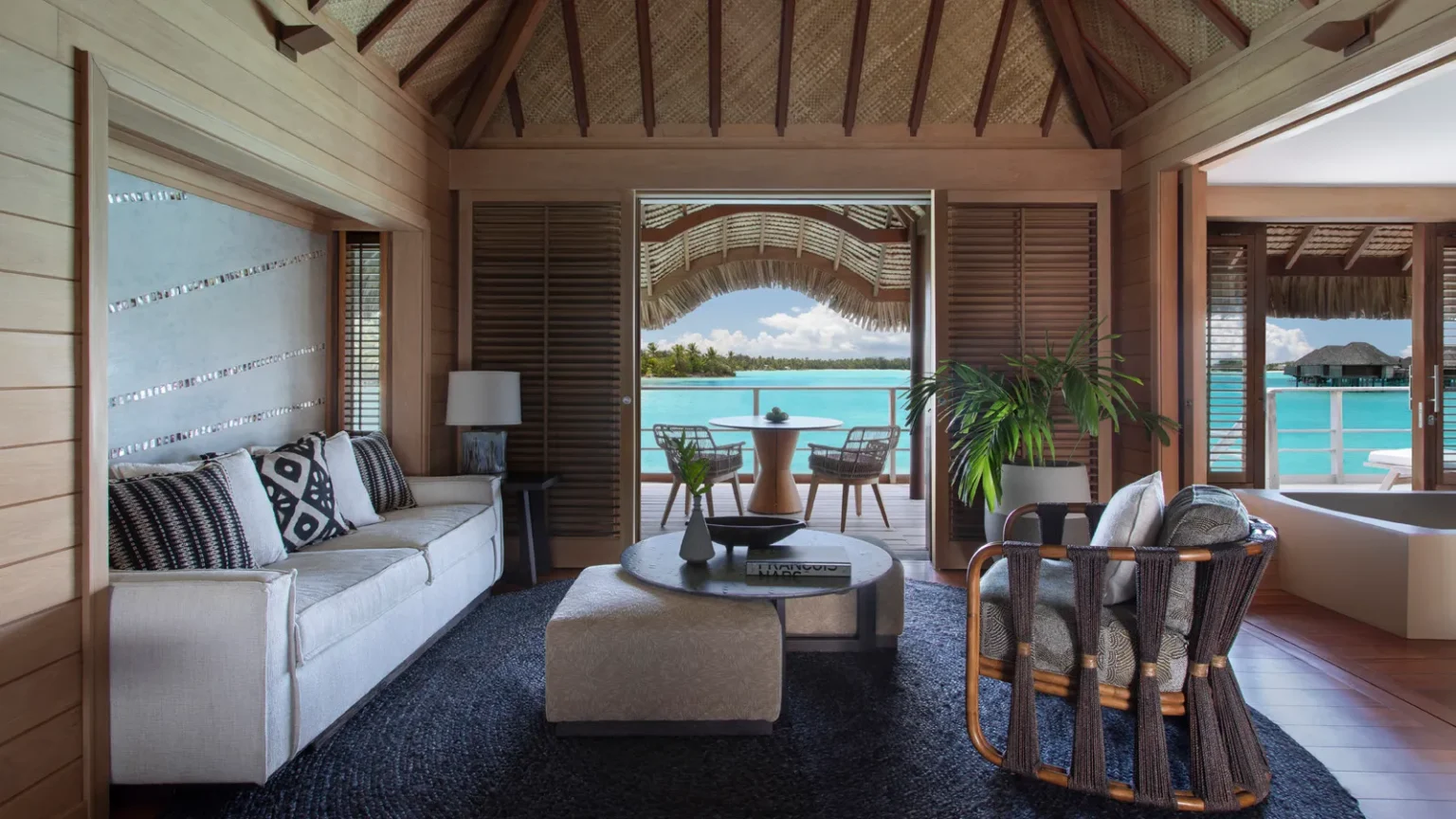 Lagün yüzeyinden 3-6 m (10-20 ft) yükseklikte inşa edilmiş 500’den fazla su üstü bungalov, mutlak mahremiyet garanti eder. Her birinde doğrudan turkuaz suya inen özel bir teras ve panoramik manzaralı bir plunge pool bulunur. Karakteristik cam zemin, ” Tahitian TV ” olarak adlandırılır – salonu mercanlar ve tropikal balıklarla dolu özel bir akvaryuma dönüştürür.