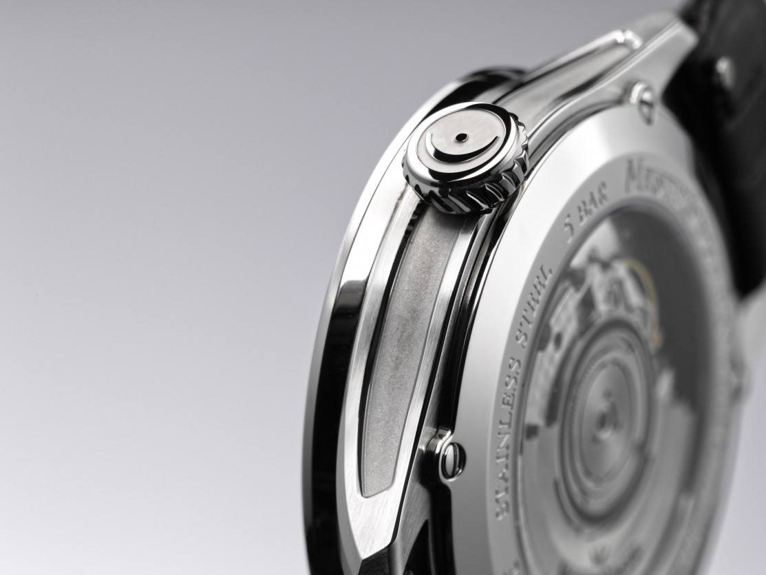 6 rakamının hemen üzerinde, saniyede bir dönen küçük bir çark bulunur, buna “sun wheel” denir. Bu, saatin çalıştığını klasik şekilde saniye ölçmeden doğrulamanın zarif bir yoludur. Kasa 40,5 mm çapında ve yaklaşık 11,25-12,3 mm kalınlığındadır, su geçirmezlik seviyesi 5 bar (50 m). Ön tarafta AR kaplamalı safir cam, arka tarafta cam kapak (inci desenli modül ve üç fermata sahip antrasit rotor görülebilir). Spiral tepe, karışık yüzeyler: fırçalanmış, cilalanmış, kumlanmış.